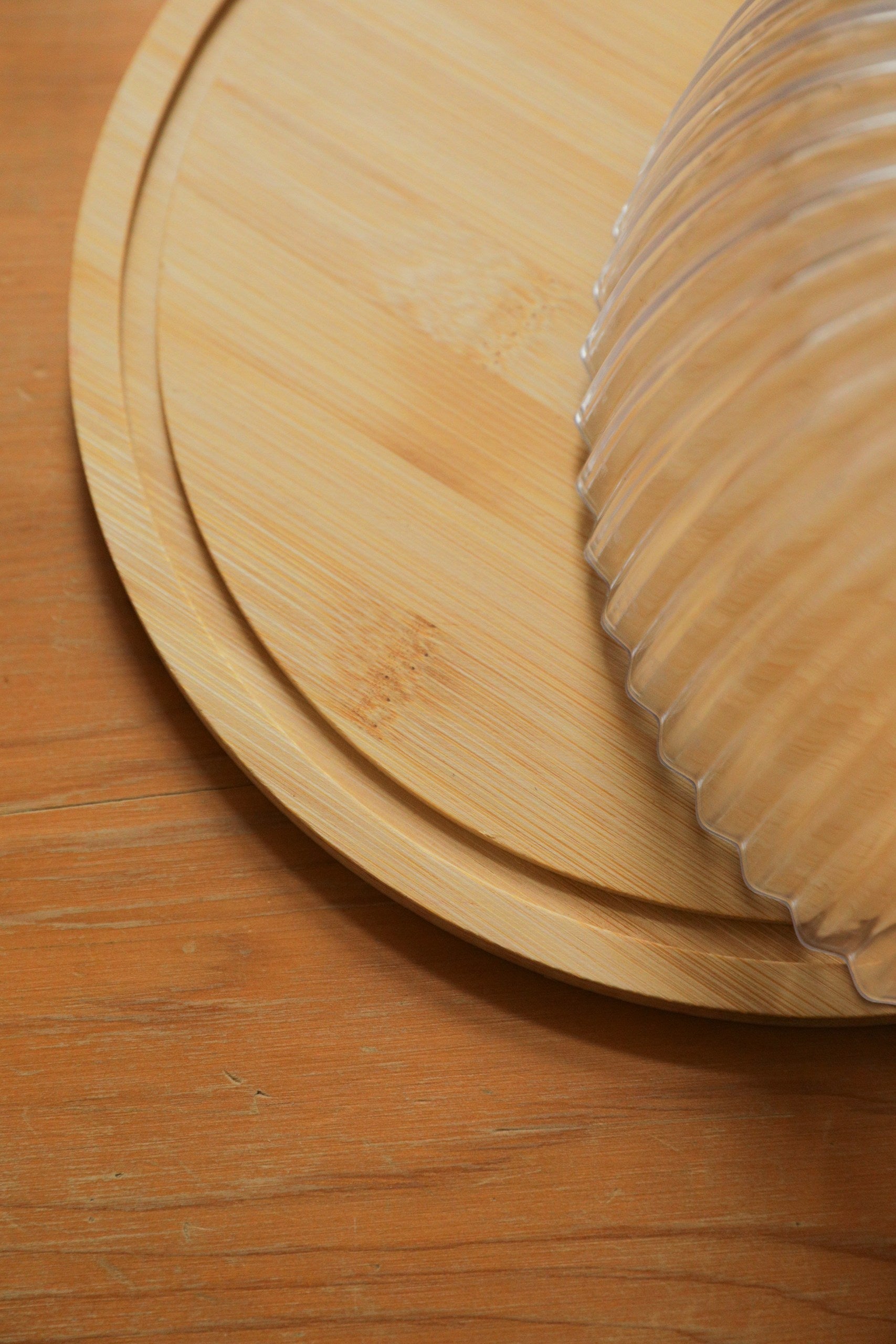 Cake stand with a wooden board base and an acrylic cover, designed for presenting cakes or desserts.