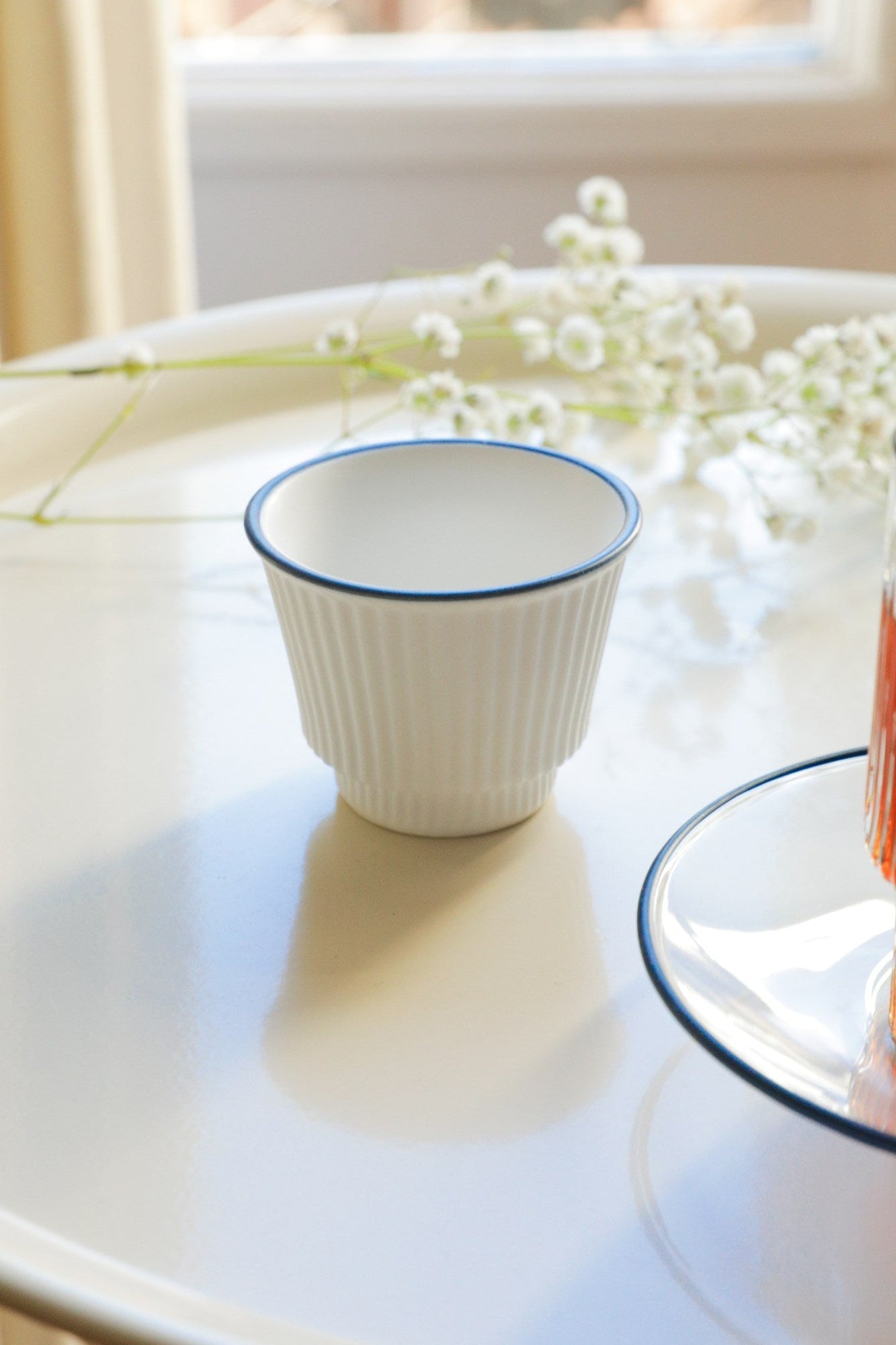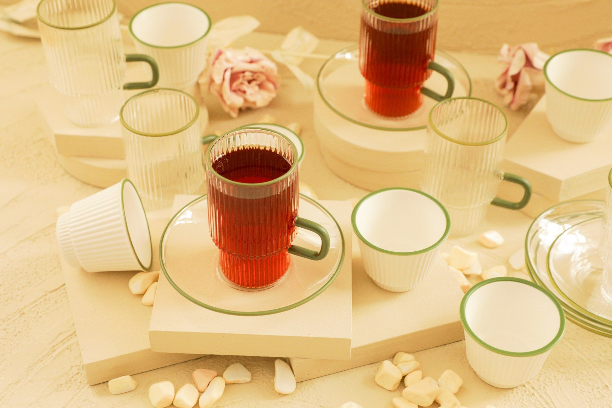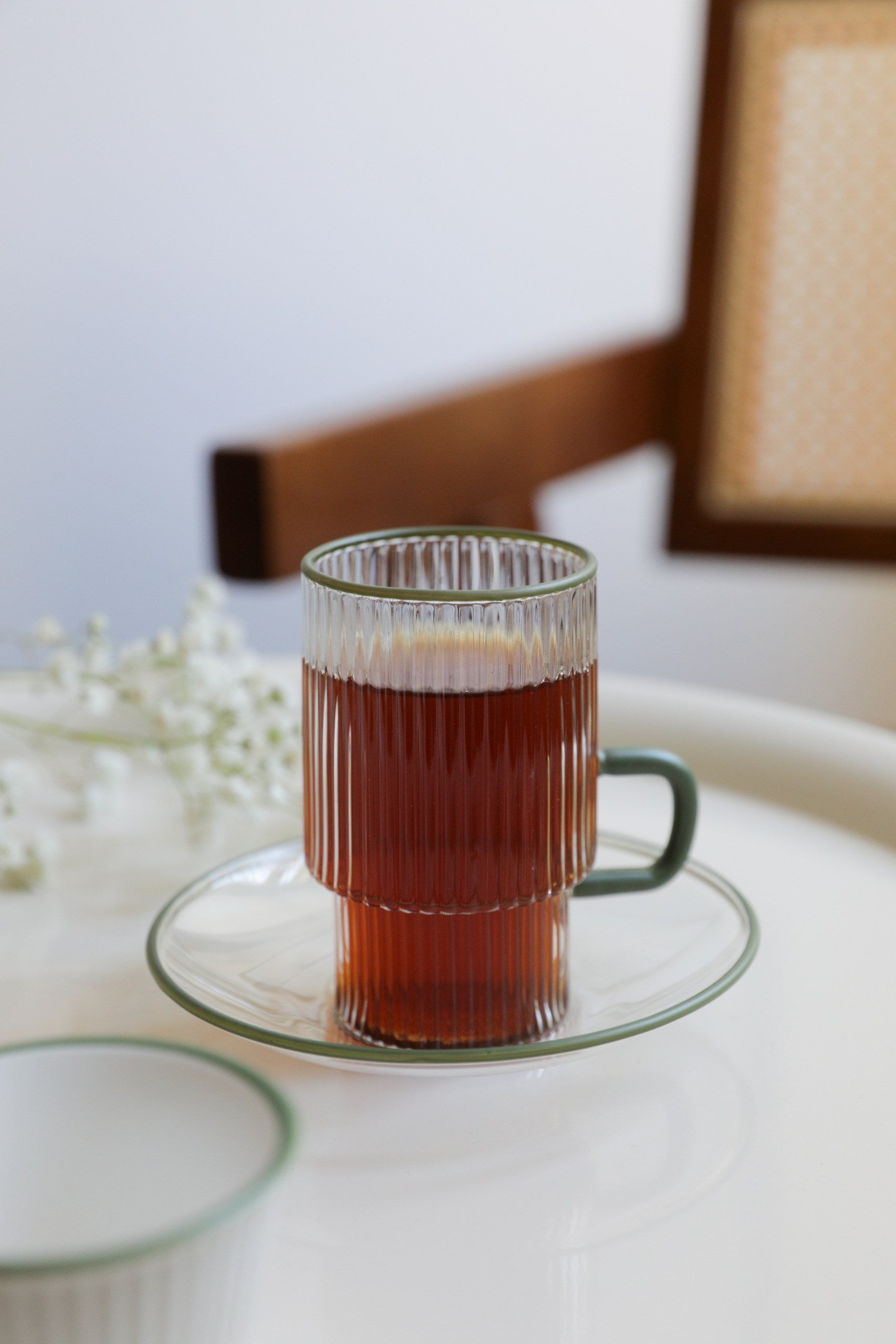A fluted tea glass cups with saucers and matching ceramic coffee cups. Defined by rippled texture and unique modern shape.