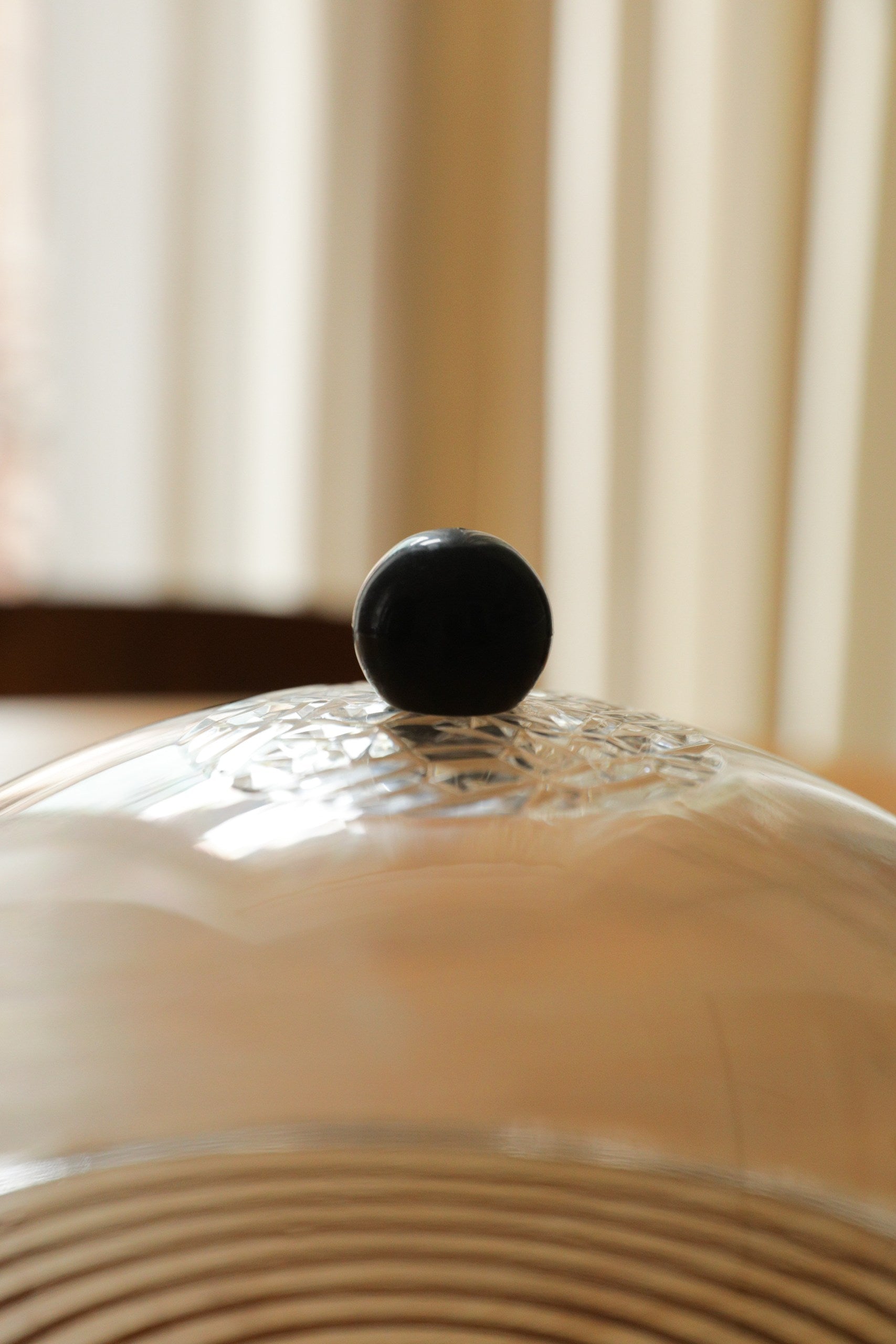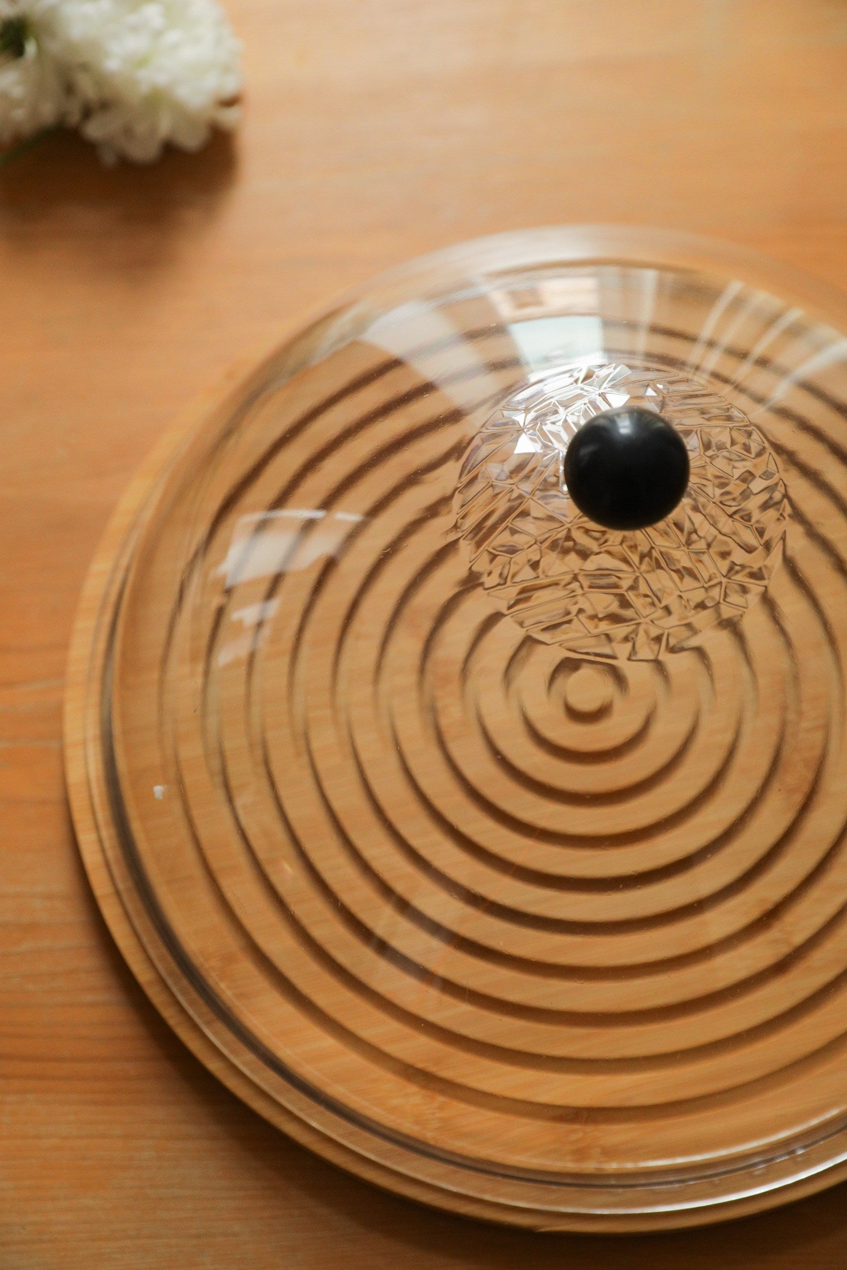 Cake stand with an engraved wooden board base and an acrylic cover, featuring a black handle knob, suitable for presenting cakes or desserts.