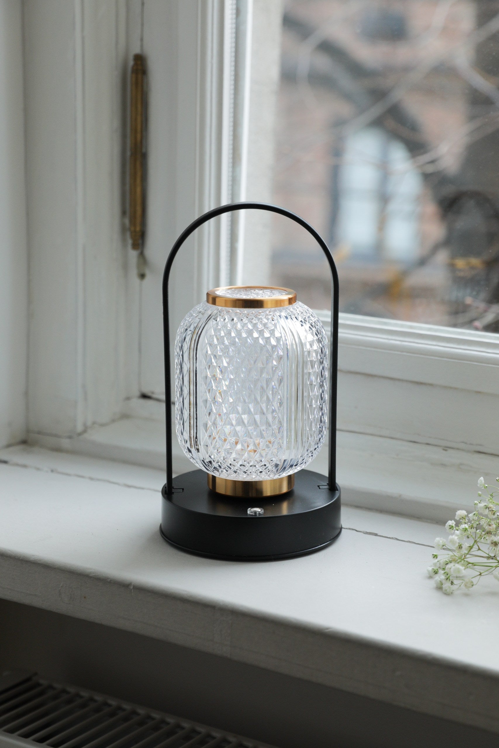 USB rechargeable battery lamp made of plastic and metal, finished in black and gold accents. Suitable for table or decorative lighting.