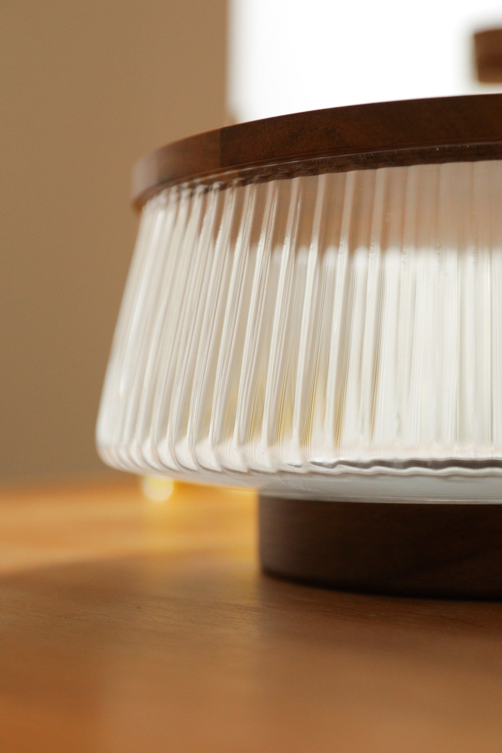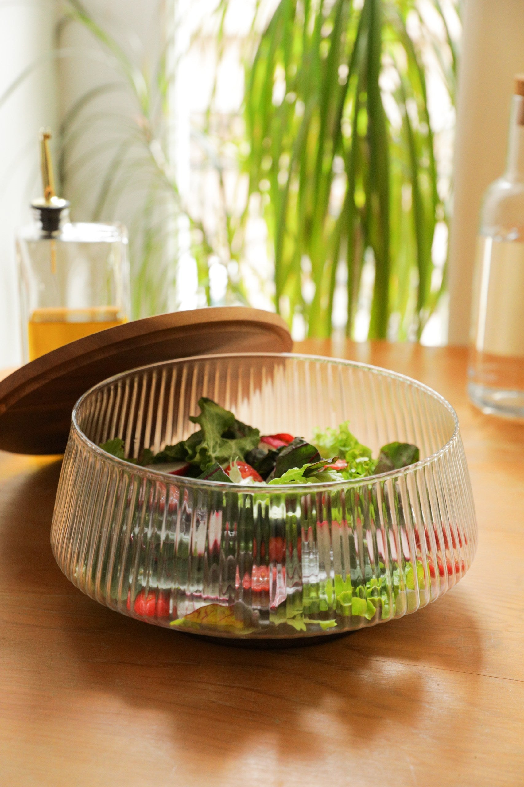 Salad bowl with a clear ribbed glass, a wooden base, and a matching lid, suitable for serving and storing salads or shared dishes.
