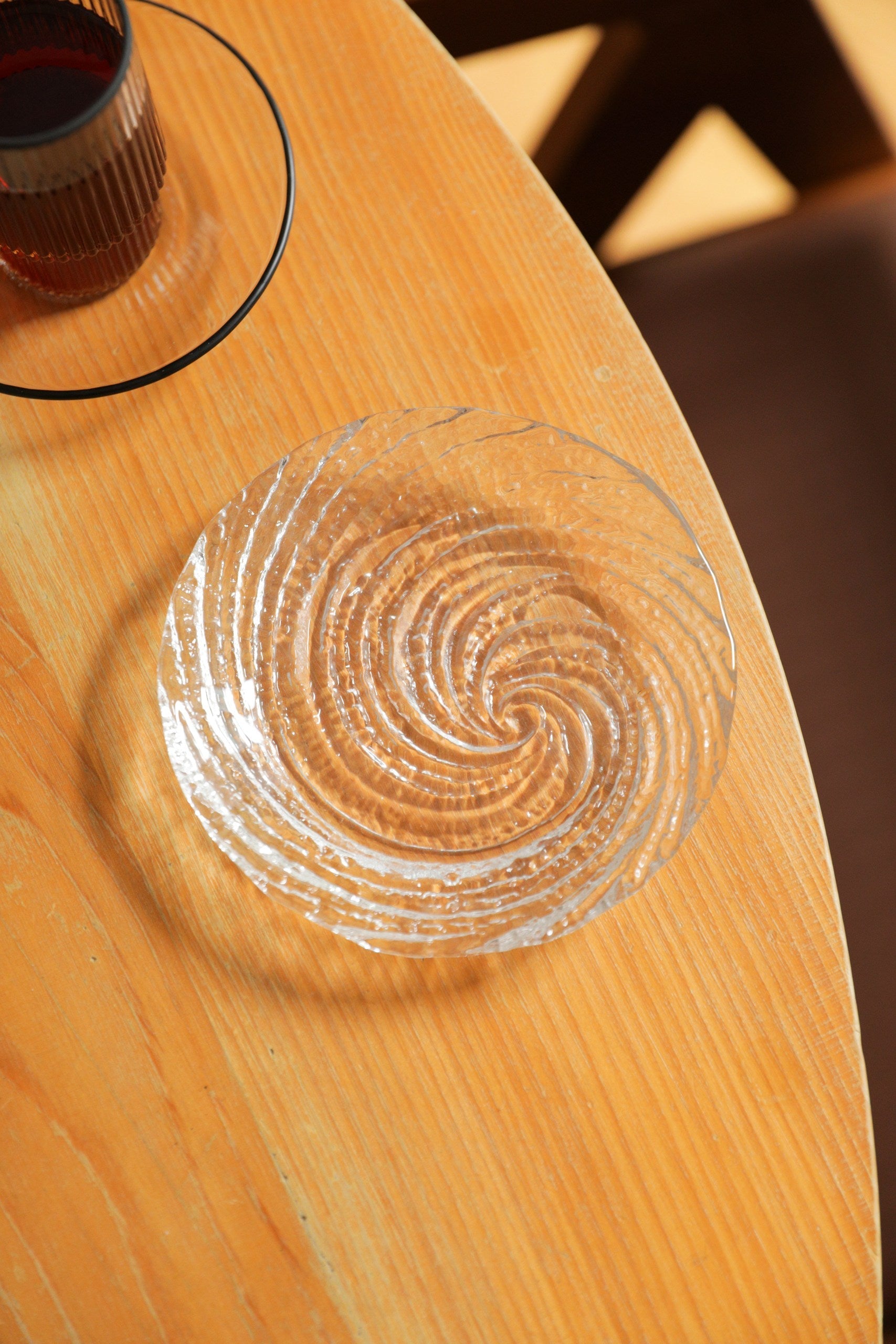 Glass desserts plate set of 6 pieces with a textured spiral surface, suitable for serving desserts or small bites.