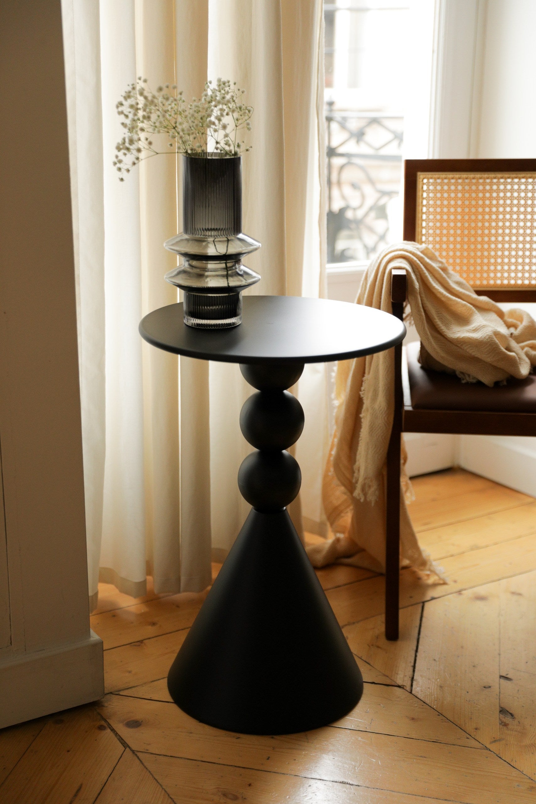 Black color side table made of iron with a round tabletop and a sculpted pedestal base featuring stacked spherical elements in the stem, suitable for use next to sofas or seating areas.